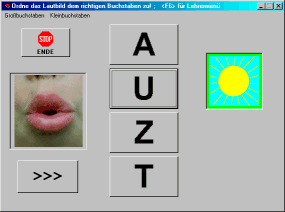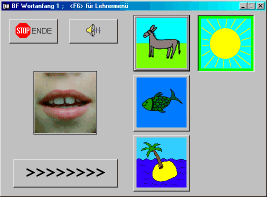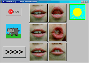 BF Lautbilder lesen Hier bekommen die Schüler ein Wort in "Lautschrift" gezeigt. Zur Auswahl stehen drei Möglichkeiten in Form von Bildern, was diese Lautfolge bedeutet. Mit 20 verschiedenen Wörtern, die in zufälliger Reihenfolge abgerufen werden. |