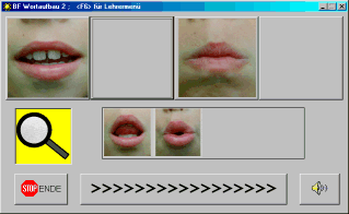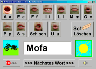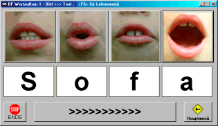 BF Wortaufbau 1 Die Kinder sehen zuerst ein Wort in Form von Lautbildern. Durch den Mausklick darauf werden die Buchstaben gezeigt. So können sie die Wörter Buchstabe für Buchstabe aufbauen. Enthält 20 Wörter, Liste erweiterbar. Außerdem auch zuerst Wort, dann Laute möglich. |